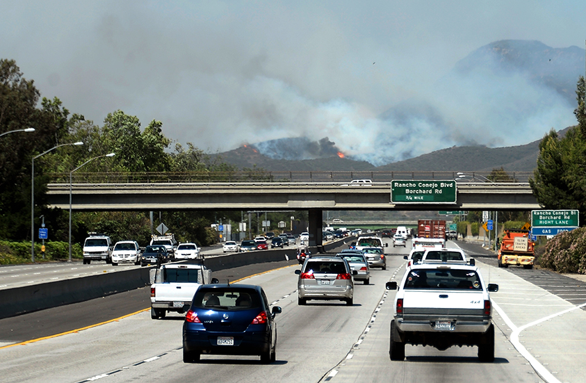NEWBURY PARK, CA – MAY 02: Cars travel on the 101 Freeway as a wildfire burns in the hills nearby on May 2, 2013 in Newbury Park, California. Winds have made fighting the blaze, called the Springs Fire, more difficult and authorities have ordered some mandatory evacuations in the area. Kevork Djansezian/Getty Images/AFP