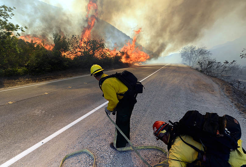 CAMARILLO, CA – MAY 02: US Forestry fire fighters preapre to take on an out of control wildfire on May 2, 2013 in Camarillo, California. Hundreds of firefighters are battling wind and dry conditions as over 6000 acres have already been burned northwest of Los Angeles. Kevork Djansezian/Getty Images/AFP