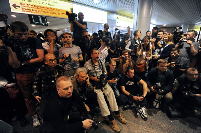 Russian journalists wait for the arrival of former US spy Edward Snowden at the Moscow Sheremetevo airport on June 23, 2013. Snowden arrived on June 23, 2013 in Russia from Hong Kong, reportedly on his way to Venezuela, escaping the clutches of US justice after leaking sensational details of cyber-espionage by Washington. Snowden, the target of a US arrest warrant issued on June 21, 2013 after he blew the lid on massive secret surveillance programmes, arrived in Moscow on a direct flight operated by Russian flag carrier Aeroflot. AFP PHOTO / VASILY MAXIMOV