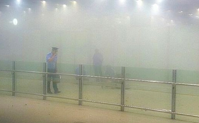 A policeman stands amid smoke at the arrival gate B after an explosion at the Terminal 3 of Beijing Capital International Airport in Beijing, July 20, 2013. A man in a wheelchair detonated a home-made explosive in Beijing airport on Saturday evening, injuring himself and sending smoke billowing through the exit area of the international arrivals section of Terminal 3. REUTERS/Stringer (CHINA – Tags: DISASTER CIVIL UNREST TRANSPORT) CHINA OUT. NO COMMERCIAL OR EDITORIAL SALES IN CHINA – RTX11SRM