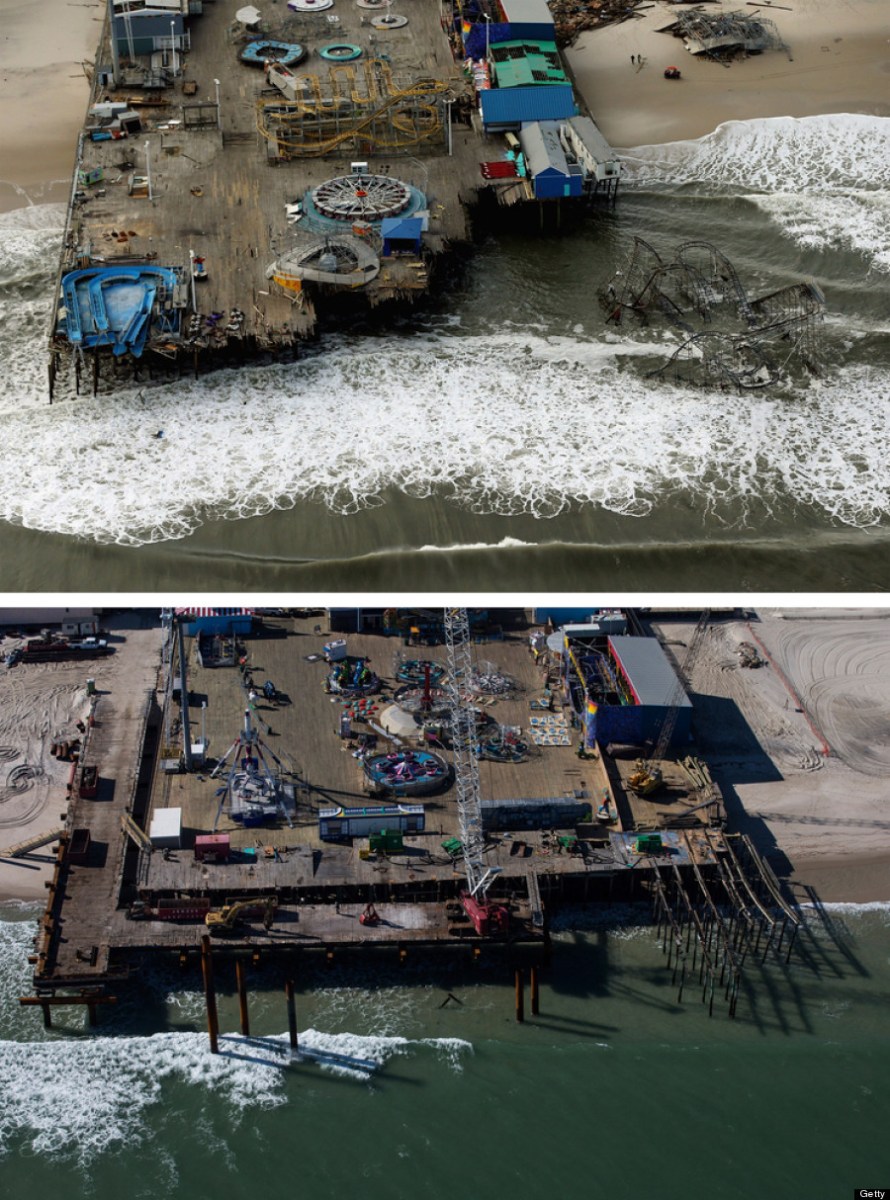 SEASIDE HEIGHTS, NJ – OCTOBER 31: (top) The boardwalk and amusement park in Seaside Heights, New Jersey is shown destroyed by Superstorm Sandy on October 31, 2012. (Photo by Mario Tama/Getty Images) SEASIDE HEIGHTS, NJ – OCTOBER 21: (bottom) The boardwalk and amusement park in Seaside Heights, New Jersey is shown October 21, 2013. Hurricane Sandy made landfall on October 29, 2012 near Brigantine, New Jersey and affected 24 states from Florida to Maine and cost the country an estimated $65 billion. (Photo by Andrew Burton/Getty Images)