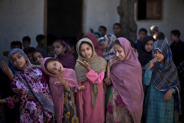 Pakistani schoolgirls, who were displaced with their families from Pakistan’s tribal areas due to fighting between the Taliban and the army, sing with their teacher before starting their classes, at their makeshift school on the outskirts of Islamabad, Pakistan, Monday, Oct. 14, 2013. Official statistics released by the Federal Education Ministry of Pakistan give a desperate picture of education for all, especially for girls. The overall literacy rate is 46 per cent, while only 26 per cent of girls are literate. (AP Photo/Muhammed Muheisen)