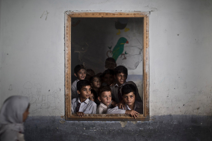 Pakistani schoolboys look out the window of their classroom at other classmates chanting prayers to commemorate the anniversary of Malala’s shooting by Taliban, at a school in Rawalpindi, Pakistan, Wednesday, Oct. 9, 2013. One year after a Taliban bullet tried to silence Malala Yousufzai’s demand for education, she has published a book and is a contender for the Nobel Peace Prize. But the militants threaten to kill her should she dare return home from Britain to Pakistan, and the principal at her old school says that as Malala’s fame has grown, so has fear in her classrooms. (AP Photo/Muhammed Muheisen)