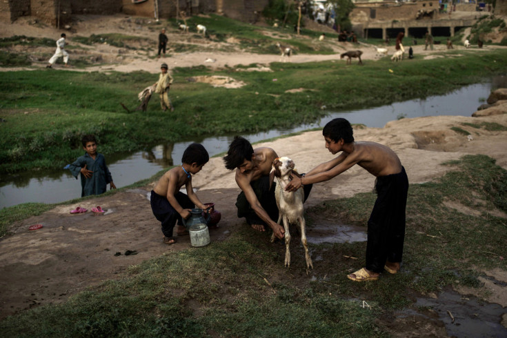 A Pakistani man and his two sons, wash their goat by a polluted stream on the outskirts of Islamabad, Pakistan, Monday, June 24, 2013. (AP Photo/Muhammed Muheisen)