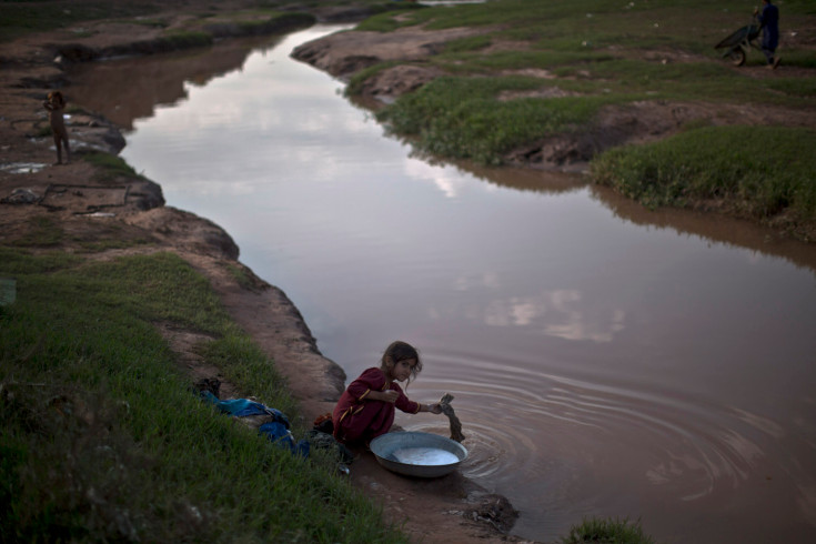An Afghan refugee washes her laundry in a polluted stream in a poor neighborhood on the outskirts of Islamabad, Pakistan, Monday, Sept. 16, 2013. Pakistan hosts over 1.6 million registered Afghans, the largest and most protracted refugee population in the world, with thousands living without electricity, running water and other basic services, according to the U.N. refugee agency. (AP Photo/Muhammed Muheisen)