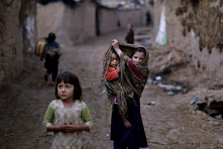 An Afghan refugee girl, center, uses her head scarf to cover her sleeping sister, while walking in an alley of a poor neighborhood on the outskirts of Islamabad, Pakistan, Tuesday, April 9, 2013. Pakistan hosts over 1.6 million registered Afghans, the largest and most protracted refugee population in the world, according to the U.N. refugee agency. (AP Photo/Muhammed Muheisen)