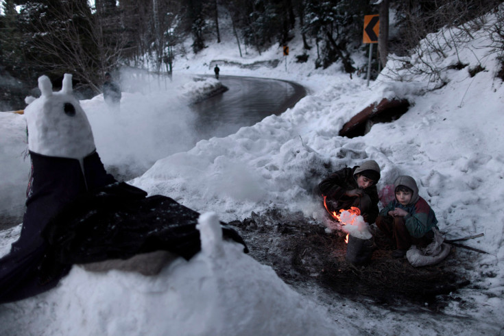 Pakistani Anwar Ali, 13, center, and his brother Hamad, 8, sit around a fire to warm themselves from the cold, while waiting for customers to pose for a picture next to a snow statue they built on a roadside, in Murree, near Islamabad, Pakistan, Wednesday, Jan. 9, 2013. (AP Photo/Muhammed Muheisen)