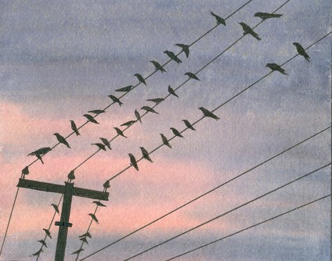 Birds on wires -pen and ink 04