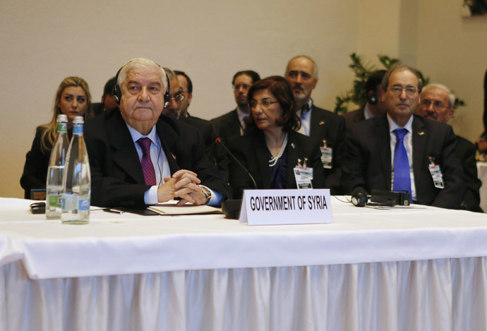 Syria’s Foreign Minister Walid al-Moualem (L) leads his delegation during a plenary session in Montreux January 22, 2014. International peace talks to address Syria’s almost three-year-old civil war opened in Montreux near Geneva on Wednesday with a speech by U.N. Secretary General Ban Ki-moon. REUTERS/Gary Cameron (SWITZERLAND – Tags: POLITICS) – RTX17PB6