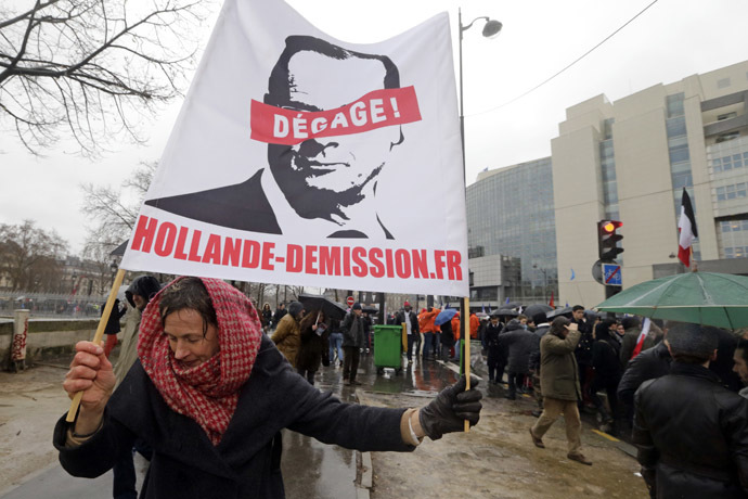 A demonstrator holds a banner which reads, “Hollande Resign” as several thousand people attend the “Journee de la Colere” (Day of Anger) march in protest of France’s President Francois Hollande, in Paris January 26, 2014. REUTERS/Philippe Wojazer (FRANCE – Tags: POLITICS) – RTX17VDC