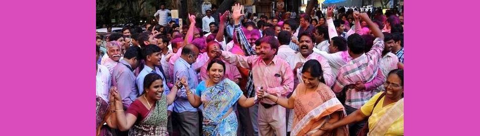 Telangana supporters dance to celebrate after India’s lower house passed a proposal to split Andhra Pradesh and create the new state of Telangana, in the southern Indian city of Hyderabad February 18, 2014. India’s lower house passed a contentious proposal to split Andhra Pradesh and create the new state of Telangana on Tuesday amid chaotic scenes and uproar in parliament from opponents of the bill. The state capital Hyderabad, where Google, Microsoft and Dell have major sites, will remain the common capital for the two states for a period of 10 years if the bill is passed in the upper house. REUTERS/Stringer (INDIA – Tags: POLITICS)