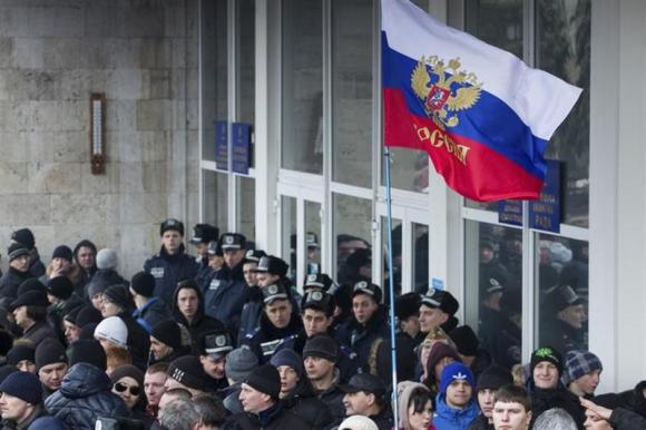 Pro-Russian protesters with the Russian Presidential flag take part in a rally in central Donetsk March 1, 2014. REUTERS/Stringer