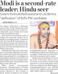మోడి వ్యక్తి పూజని ప్రోత్సహిస్తున్నారని స్వామీ అవిముక్తేశ్వర అభ్యంతరం చెప్పారు. “మోడి సెకండ్ రేట్ నాయకులు. ఆయన ఉన్నత స్ధాయి నాయకులు కాదు. ఆయన నిజమైన నాయకులైనట్లయితే ‘హర హర మోడి’ అంటూ కార్యకర్తలు నినాదాలు ఇస్తున్నపుడే మోడి వారిని కూకలు వేసి ఉండేవారు” అని ఆయన వ్యాఖ్యానించారని మెట్రో న్యూస్ అనే పత్రిక తెలిపింది. (కింద పేపర్ కత్తిరింపులు చూడగలరు.)