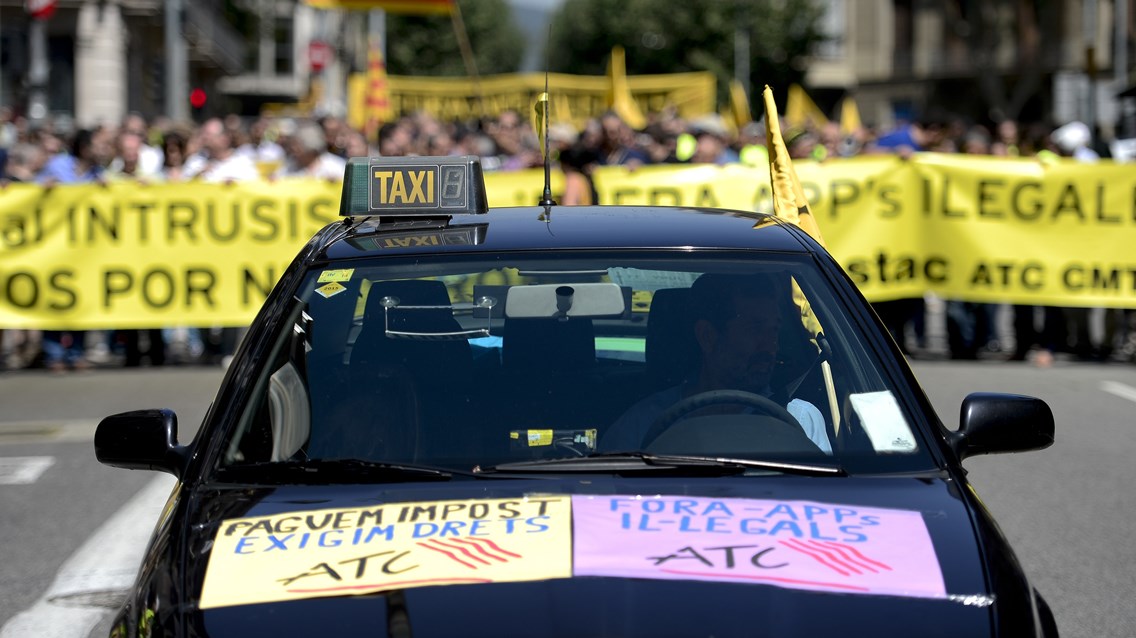 A taxi precedes demonstrators during a protest against Uber in Barcelona on Wednesday. A conventional taxi license in Spain can cost 137,000 euros ($185,400), making competition from services like Uber a major financial iss