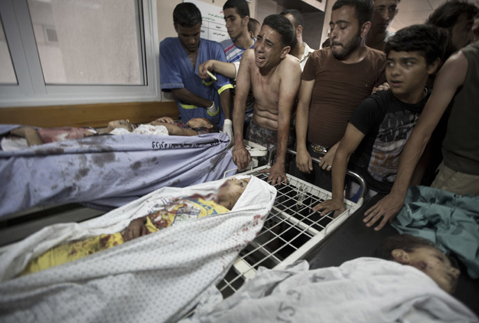 Palestinian mourners and medics gather over the bodies of six of the eight children who were killed in an explosion in a public playground in the beachfront Shati refugee camp in Gaza City on July 28, 2014. The Israeli army today categorically denied firing on a hospital and a refugee camp in Gaza City, accusing Hamas militants of misfiring their own rockets. AFP PHOTO/MAHMUD HAMS