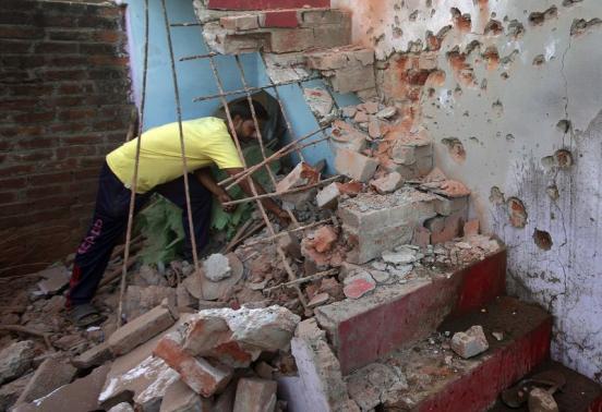 An Indian villager clears the debris from his house, which locals said was damaged by firing from the Pakistan side of the border, at Trewa village near Jammu October 7, 2014. REUTERS/Mukesh Gupta