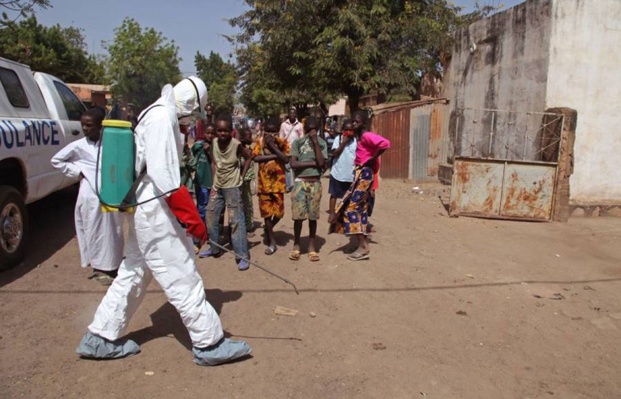 Nov. 14, 2014, a health A health worker sprays disinfectant near a mosque, Mali