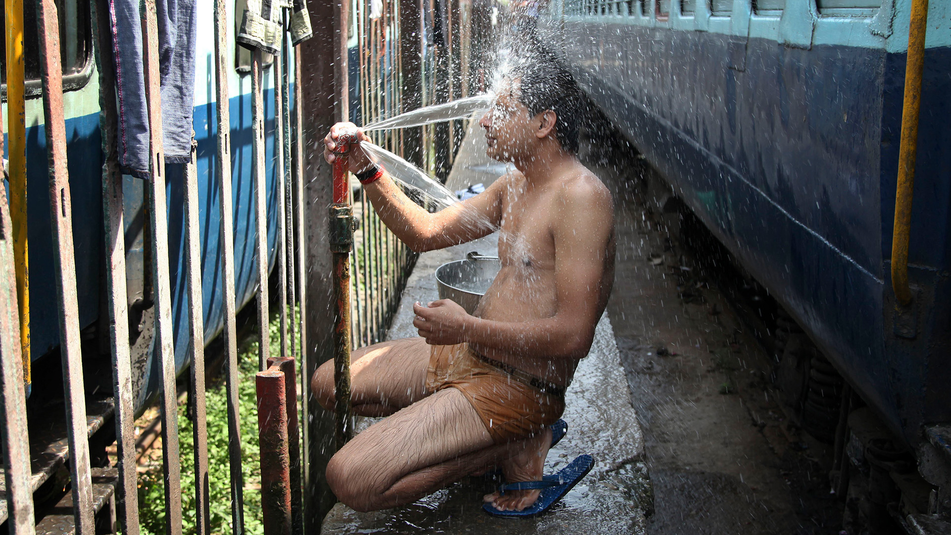 An Indian passenger takes a bath beside rail tracks