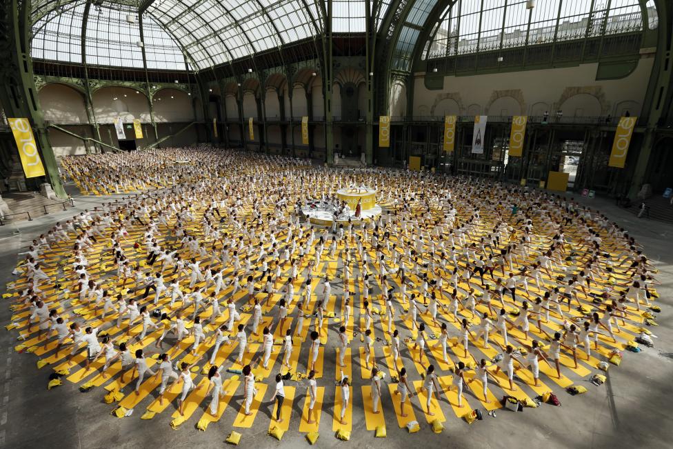 04 People take part in a group yoga practice at the Grand Palais in Paris