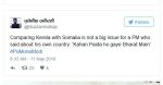 “కేరళకు మోడి తరచుగా ఎగురుకుంటూ వస్తున్నారో మనకు ఇప్పుడు అర్ధం అయింది. కేరళ = సోమాలియా అంటే ట్రావెల్ లిస్ట్ లో మరొక దేశం చేరిందన్నమాట! #PoMoneModi” అని మరో వ్యక్తి వ్యాఖ్యానించారు. ప్రధాన మంత్రి దేశాన్ని వదిలి పెట్టి తరచుగా విదేశాలకు ఎగిరి వెళ్లడాన్ని గుర్తు చేస్తూ కేరళ కూడా సోమాలియాగా మరో దేశంగా భావిస్తున్నందునే మోడి తరచుగా కేరళ ఎగిరి వస్తున్నారని ఈ వ్యాఖ్యాత భావన.