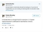 “భారత దేశం ఇప్పుడు కేరళ నమూనా పైనే ప్రధానంగా దృష్టి పెట్టాలి. గుజరాత్ వంక చూస్తే అత్యల్ప లింగ నిష్పత్తి, తక్కువ అక్షరాస్యతల వైపు చూస్తున్నట్లే. #PoMoneModi” అని మరో వ్యాఖ్యాత. మోడి ప్రధాని అయినప్పటి నుండి బిజేపి గుజరాత్ ను అభివృద్ధి నమూనాగా చూపిస్తున్న సంగతి తెలిసిందే. ఎన్నికల ముందు కూడా బిజేపి గుజరాత్ అభివృద్ధిని నమూనాగా ప్రచారం చేసింది. అతి తక్కువ ధరలకు ప్రభుత్వ, రైతుల భూములను బడా కార్పొరేట్లకు కట్టబెట్టడం, కార్మిక చట్టాలను రద్దు చేయడం లాంటి విధానాల వల్ల ప్రజలు ఆదాయ వనరులు కోల్పోయి వారి ఆడ పిల్లలకు సరైన తిండి పెట్టలేని పరిస్ధితే దాపురిస్తుంది. గుజరాత్ నమూనా అంటే అదే.