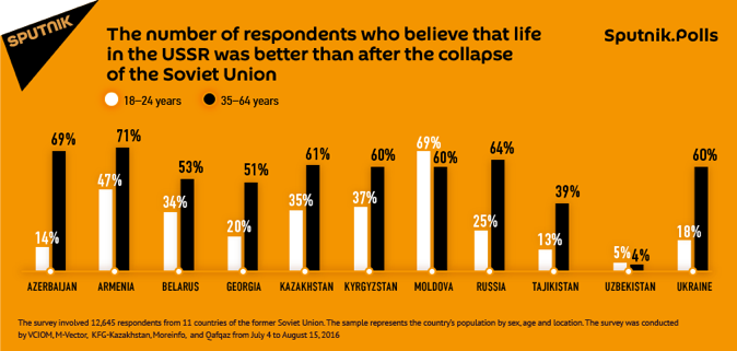 స్పుత్నిక్ న్యూస్ సంస్ధ USSR కి చెందిన 11 రాజ్యాలలో సర్వే నిర్వహించింది. ఈ 11 దేశాల్లోని 9 దేశాల్లో 35 సం. కి పైబడిన వారిలో మెజారిటీ ప్రజలు ఇప్పటికంటే సోవియట్ రష్యా కాలంలోనే జీవితం మెరుగ్గా ఉన్నాడని అభిప్రాయం వ్యక్తం చేశారు. ఆనాటి USSR లో నివసించిన ఇప్పటి రష్యా నివాసుల్లో అనగా కనీసం 35 సం. నిండిన రష్యన్ల లో 64 శాతం మంది ఇప్పటికంటే USSR లో జీవనమే మెరుగ్గా ఉండేదని భావిస్తున్నారు.