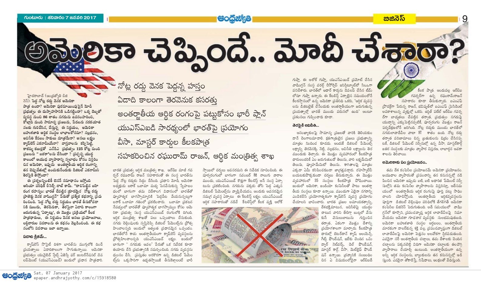 ఈ నేపథ్యంలో అమెరికా ఒత్తిడి వల్లనే భారత ప్రభుత్వం డీమానిటైజేషన్ ను బలవంతంగా భారత ప్రజలపై రుద్దిన వాస్తవాన్ని ఒక తెలుగు పత్రిక ప్రచురించడం నిజంగా సాహసమే. ఈ సాహసానికి పూనుకున్నందుకు ఆంధ్ర జ్యోతి పత్రికను తప్పకుండ అభినందించాలి. అమెరికా సామ్రాజ్యవాదం భారత ప్రజల జీవనం లోని ప్రతి ఒక్క అంశాన్ని ఏ విధంగా ప్రభావితం చేస్తున్నదో ఈ సందర్బంగా గుర్తించాలి. ఇందుకు భారత పాలకులే వాహకులుగా పని చేస్తున్నారనీ, అమెరికా పెత్తనం చొరబాటుకు తామే మద్దతు ఇస్తున్నారని ప్రజలు గ్రహించాలి. ఆధార్ కార్డు, జన్ ధన్ తదితర చర్యలన్నీ ఒక పధకం ప్రకారం దశల వారీగా ప్రవేశపెట్టి డీమానిటైజేషన్ కు అనువుగా వాతావరణం సిద్ధం చేస్తూ వచ్చారని ఈ కధనం ఆధారంగా మనం గ్రహించవచ్చు.