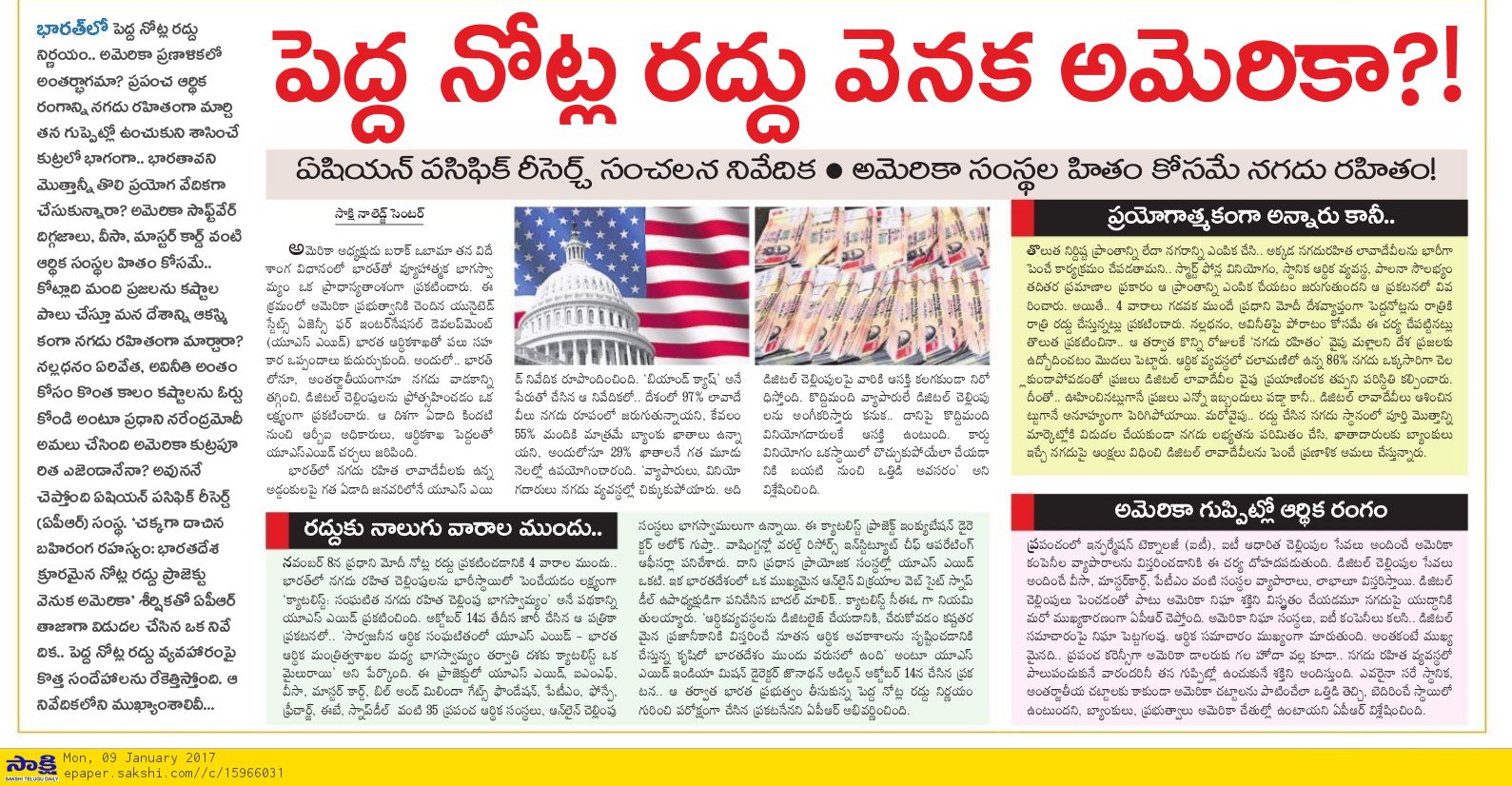 ఇది సాక్షి దిన పత్రికలో ఈ రోజు, జనవరి 9, 2017 తేదీన ప్రచురితం అయిన కధనం. నిన్న ఆంధ్ర జ్యోతి పత్రికలో వచ్చిన కధనం ఉటంకించిన సోర్స్ నే సాక్షి కధనం కూడా ఉటంకించింది. కాబట్టి రెండు కధనాలలో విషయం దాదాపు ఒకటే.