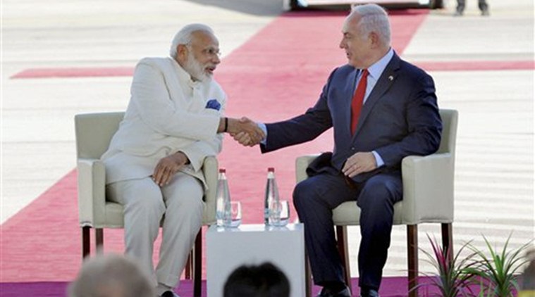 Tel Aviv :Prime Minister Narendra Modi and Israeli Prime Minister Benjamin Netanyahu during welcome ceremony upon arrival in Ben Gurion airport near Tel Aviv, Israel, Tuesday. PTI Photo(PTI7_4_2017_000272b)