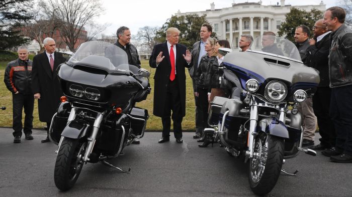 “మనకు చాలా దేశాలున్నాయి. మనం ఒక ఉత్పత్తి తయారు చేస్తాం. వారు ఒక ఉత్పత్తిని తయారు చేస్తారు… వారి దేశాల్లోకి ప్రవేశించడానికి మనం భారీ పన్నులు చెల్లించాలి – మోటార్ సైకిళ్ళు, హార్లే డేవిడ్సన్- ముఖ్యంగా ఒక దేశం గురించి చెప్పుకోవాలి. ఆ దేశం ఇండియాయే అన్న నిజాన్ని నేను ఇప్పుడు చెప్పబోవడం లేదు..”