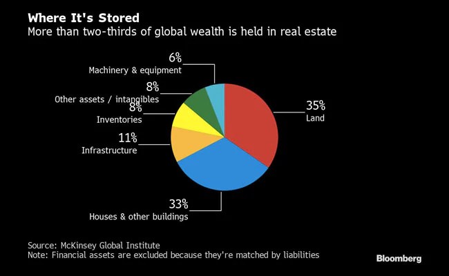 అయితే ఈ సంపద ఏయే రంగాల్లో ఉన్నది? మెకిన్సే కంపెనీ అధ్యయనం ప్రకారం ప్రపంచ నికర సంపదలో 68 శాతం రియల్ ఎస్టేట్ రంగంలోనే కేంద్రీకృతం అయి ఉన్నది. మిగతా సంపద మౌలిక నిర్మాణాలు, యంత్రాలు మరియు ఇతర పరికరాలు మొ.న రంగాల్లో ఉన్నది. కొంత సంపద మేధో సంపత్తి హక్కులు (ఐపిఆర్) మరియు పేటెంట్ హక్కుల లోనూ ఉన్నదని అధ్యయనం తెలిపింది.