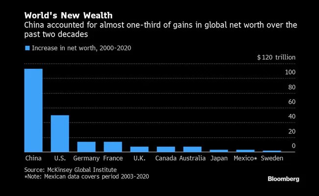 2000 సంవత్సరంలో చైనాలో నికర సంపద కేవలం 7 ట్రిలియన్ డాలర్లు. అది 2020 నాటికి 120 ట్రిలియన్ డాలర్లకు చేరింది. 2001లో చైనా డబల్యూటిఓ లో సభ్య దేశంగా చేరిన అనంతరం అమెరికా, ఐరోపాల నుండి బహుళజాతి కంపెనీలు చైనాకు వరుస కట్టాయి.