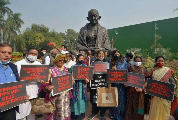Suspended MPs protest at Gandhi statue