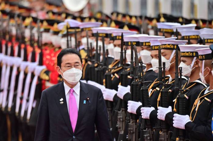 Japan’s Prime Minister Fumio Kishida inspects the honour guard at Government House in Bangkok on May 2, 2022, on his official visit to Thailand. -AFP)