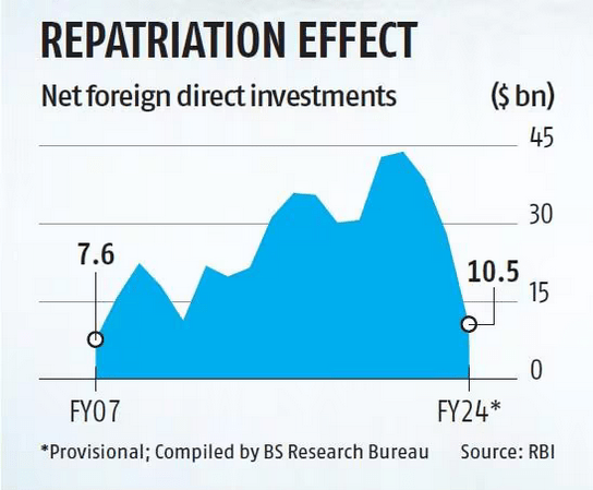 2023-24 ఆర్ధిక సం. లో దేశం లోకి వచ్చిన నికర విదేశీ ప్రత్యక్ష పెట్టుబడులు (ఎఫ్.డి.ఐ) కేవలం 10.58 బిలియన్ డాలర్లు మాత్రమే. నికర ఎఫ్.డి.ఐలు ఇలా పెద్ద మొత్తంలో తగ్గిపోవడానికి ప్రధాన కారణం విదేశీ పెట్టుబడులు పెద్ద మొత్తంలో తమ లాభాలను తరలించుకు వెళ్ళడమే అని ఆర్.బి.ఐ తెలియజేసింది. దానితో పాటు భారత పెట్టుబడిదారులు సైతం గణనీయ మొత్తంలో దేశం లోని వారి పెట్టుబడిని విదేశాల్లో ఇన్వెస్ట్ చేసేందుకు తరలించుకుపోవడం కూడా ఒక కారణంగా తెలుస్తోంది.